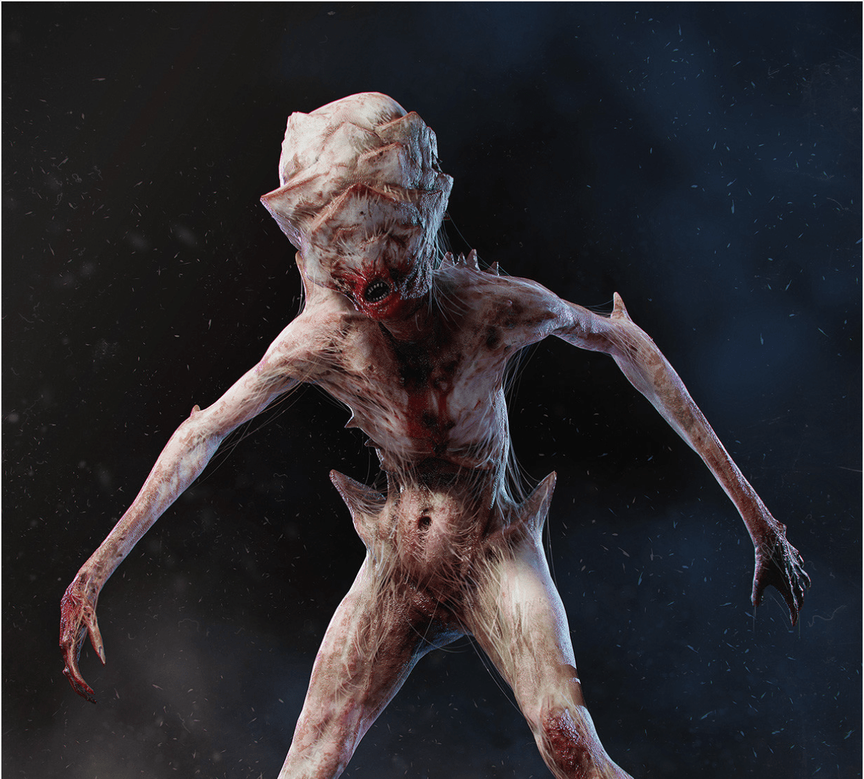 There are multiple interesting elements to this character. Firstly, it has no eyes, so that tells me that sound is incredibly important to this character. The creature can use sound to sense nearby players, so it’ll need some short sounds. Somewhat like a bat, the creature could use sonar to detect the space.